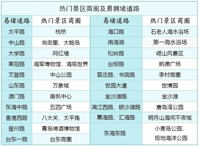 预计各景区景点、前海一线、网红打卡地、亲子乐园、休闲农庄、露营基地等区域将迎来客流高峰,届时景区周边交通流或呈饱和态势。据在线旅行服务平台预测,中秋假期青岛热门景区为五四广场、栈桥、八大关、海底世界、极地海洋公园、青岛啤酒博物馆、太平山、石老人海水浴场等。白天时段太平路、莱阳路、南海路文登路路口,晚间时段香港路、澳门路等路段都是交通流量易聚集的区域,预计会引发通行效率下降、停车资源供求不平衡等情况。