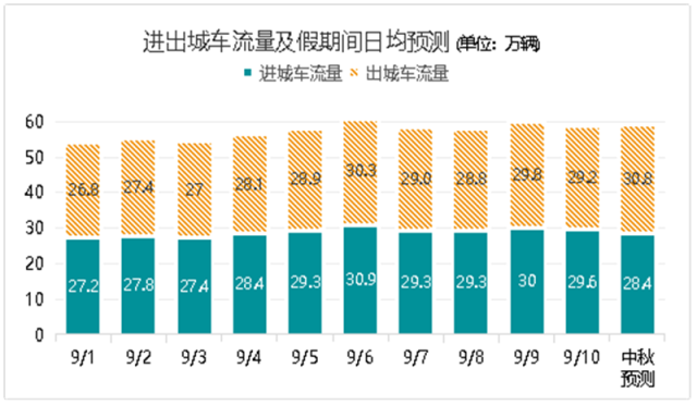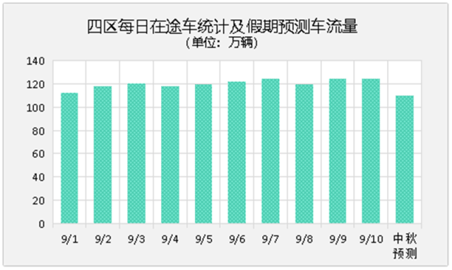 节假日期间各旅游区域、路线、商圈、交通节点将呈现短时集中、潮汐式交通流等特点。市区出行集中约9时左右,主干道、景区周边道路或现车辆排队缓行的情况,晚间出行车辆将明显多于平日。根据往年车流量变化规律分析,预计今年中秋假期市内四区日均在途车约110万辆,与平日均值基本持平。