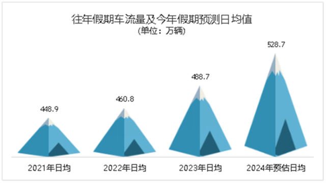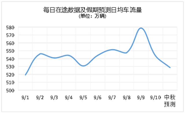 结合往年假期出行特点和近期交通运行情况分析,预计中秋期间全市在途车流量较2022年同期增长14.7%,较2023年(2023年中秋节与国庆节相连,只与假期前3天对比)增长8.2%,但相较于8月份暑期旅游旺季的车流量日均值略有下降,日均约528.7万辆。