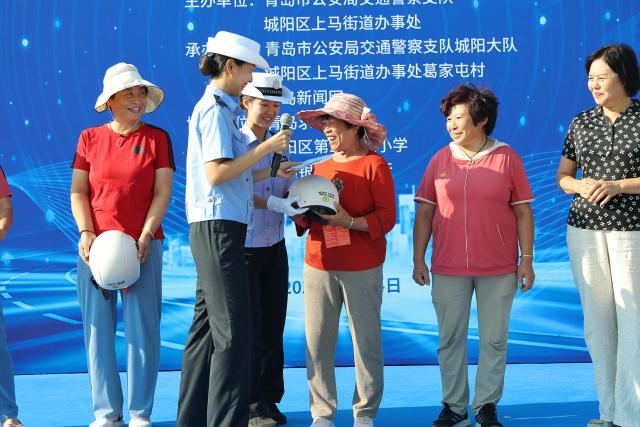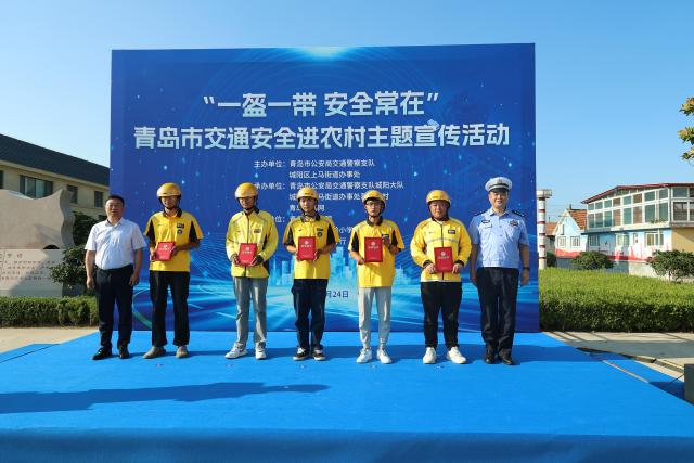 9月24日下午,青岛市交通安全进农村主题宣传活动在城阳区上马街道葛家屯村举行。活动围绕“一盔一带 安全常在”主题,以文艺表演、交通安全宣讲、志愿者代表倡议、为“文明骑手”颁奖、现场互动体验等形式,倡导广大村民自觉抵制交通违法行为,养成佩戴头盔、系好安全带的习惯,安全文明出行。青岛市公安局交警支队、城阳区上马街道办事处、交警城阳大队、城阳区上马街道办事处葛家屯村、青岛新闻网、青岛求实学院、城阳区第二实验小学、交通银行青岛分行等单位负责同志,快递外卖骑手代表、村民和新闻媒体记者参加活动。