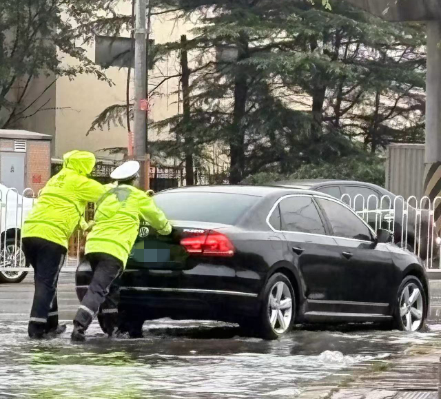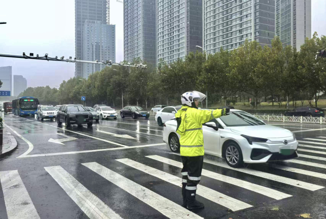 10月17日夜间开始,青岛市西海岸新区瞬时雨量骤增,多处路段因排水不畅出现了积水险情。黄岛交警迅速反应,紧急启动恶劣天气应急措施,提高巡逻密度,在城区各个路口处,交警们穿着反光雨衣,冒着大雨坚守岗位,通过警灯闪烁、荧光绿值守提醒等方式,提醒路面驾驶员要“降速、控距、亮尾”,警示非机动车绕行渗水路段,防止道路交通事故和涉水类险情的发生。