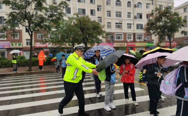 傍晚时分,青岛市西海岸新区出现风雨天气,路面湿滑难行,多处路口出现了路面积水车流缓慢行驶的现象,为确保辖区道路交通环境安全、有序,预防和减少交通事故的发生,青岛市公安局黄岛分局交警大队全警上路,在风雨中坚守岗位,全力疏导指挥交通,确保道路交通安全有序畅通。
