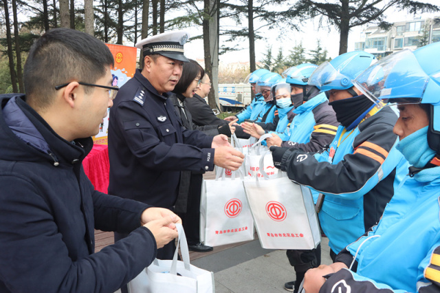 为进一步提高辖区快递外卖骑手文明交通意识和守法观念,深入落实秋冬季道路交通事故预防九条措施,预防和减少道路交通事故,12月12日上午,青岛市市北区总工会、交警市北大队联合开展“爱在寒冬 安全相伴”慰问一线劳动者“送温暖”暨外卖骑手交通安全宣教活动。