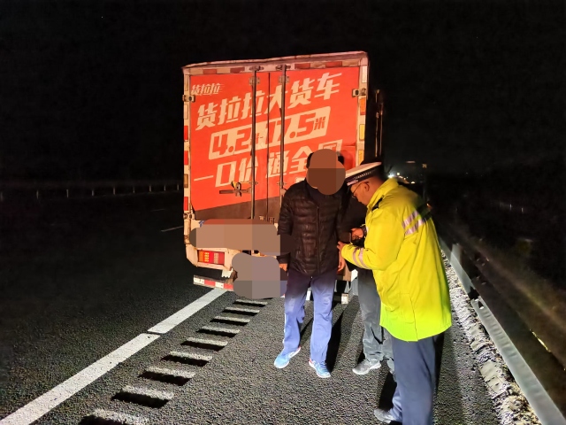近日,山东高速交警高密大队民警在夜间巡逻中发现,在G20青银高速青岛方向80公里+700米处,一蓝牌小型货车停靠应急车道,同时一行人站在第四车道处修理主驾驶位故障,且后方未摆放三角标志,存在极大的安全隐患,民警立即上前予以纠正。