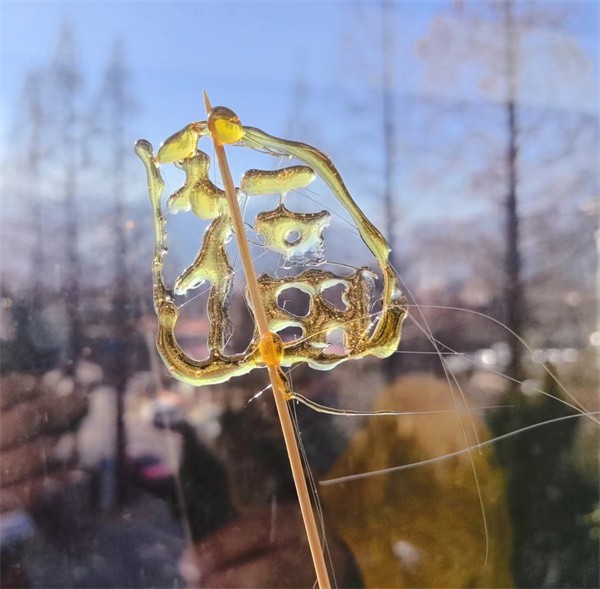 活动现场,糖画老师给孩子们讲解了制作糖画的原料、如何熬糖和糖画的制作过程:用麦芽糖配比一定的白糖,在锅子里熬制,熬到可以牵丝时,用小汤勺舀起糖汁在板上飞快地来回浇画。不一会儿,一个个晶莹剔透的小爱心、小星星就成型了。