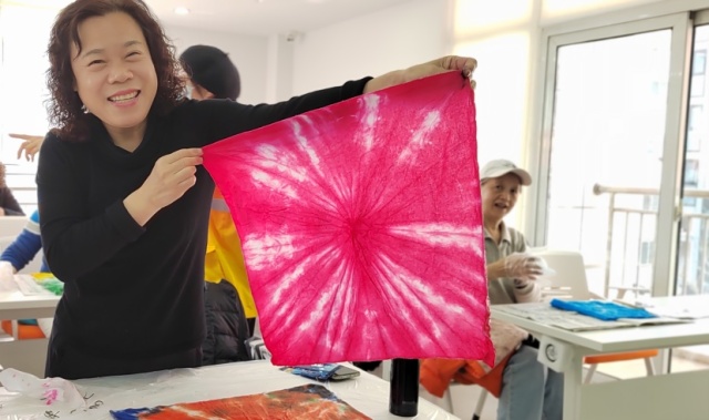 随后,居民领取到布料和染料,开始动手制作自己的扎染作品。折叠、捆扎、染色……大家充分发挥自己的想象力进行创作,有的按照图样将方巾折叠捆扎,有的按照自己的方式进行捆扎,并将扎好的方巾放进染料中。解绑抖开的瞬间,大家都被一件件层次分明、花样丰富、各具特色的作品所惊艳。