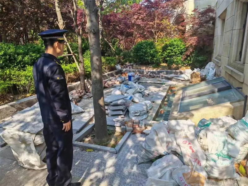 近日,金家岭街道麦岛综合行政执法中队接群众举报:位于青大三路的颐山源墅小区有一楼业主破坏公共绿地硬化地面。接举报后,执法人员第一时间赶往现场查看处理。