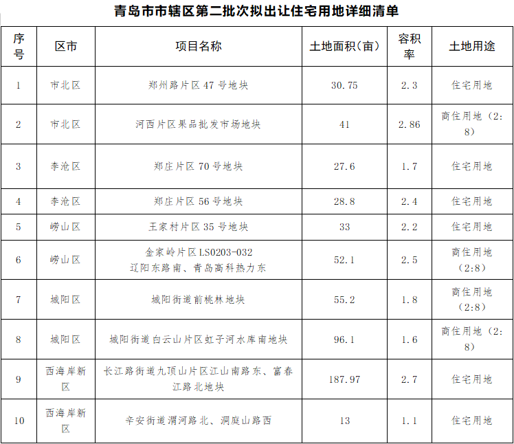 据了解,5月23日,青岛市发布市辖区2024年第二批次拟出让住宅用地详细清单,共10宗住宅用地,占地面积约37.7万㎡,规划建筑面积85.45万㎡,其中包括崂山王家村地块、河西片区地块等优质地块。这些地块位于我市重点打造的优质区域,将优先配套优质的教育、医疗、养老等资源,进一步提升区域发展潜力。