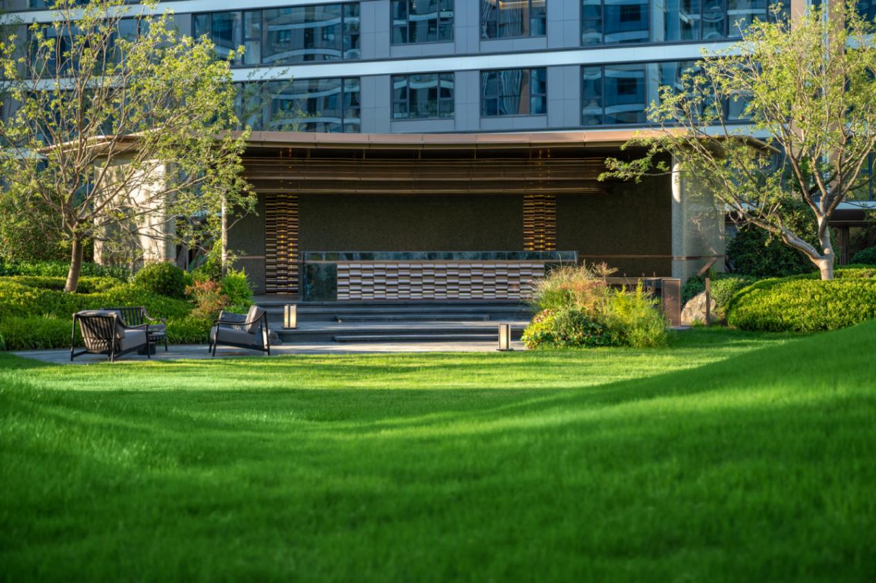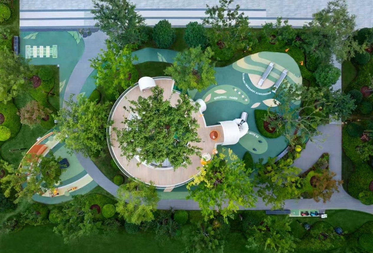 约75米横向挑檐社区大门,如舒展的城市天际线切片,大门两侧约3300㎡乌桕树园林,枝叶在光影里织就细碎的鎏金纹路,每一步踏在石板路上,都像踩进了“已经住了很久”的日常,园区里那棵约15米高的百年朴树是社区的“时光锚点”,胸径约1.2米的树干托着浓荫,连风穿过枝叶的声音都透着沉静。