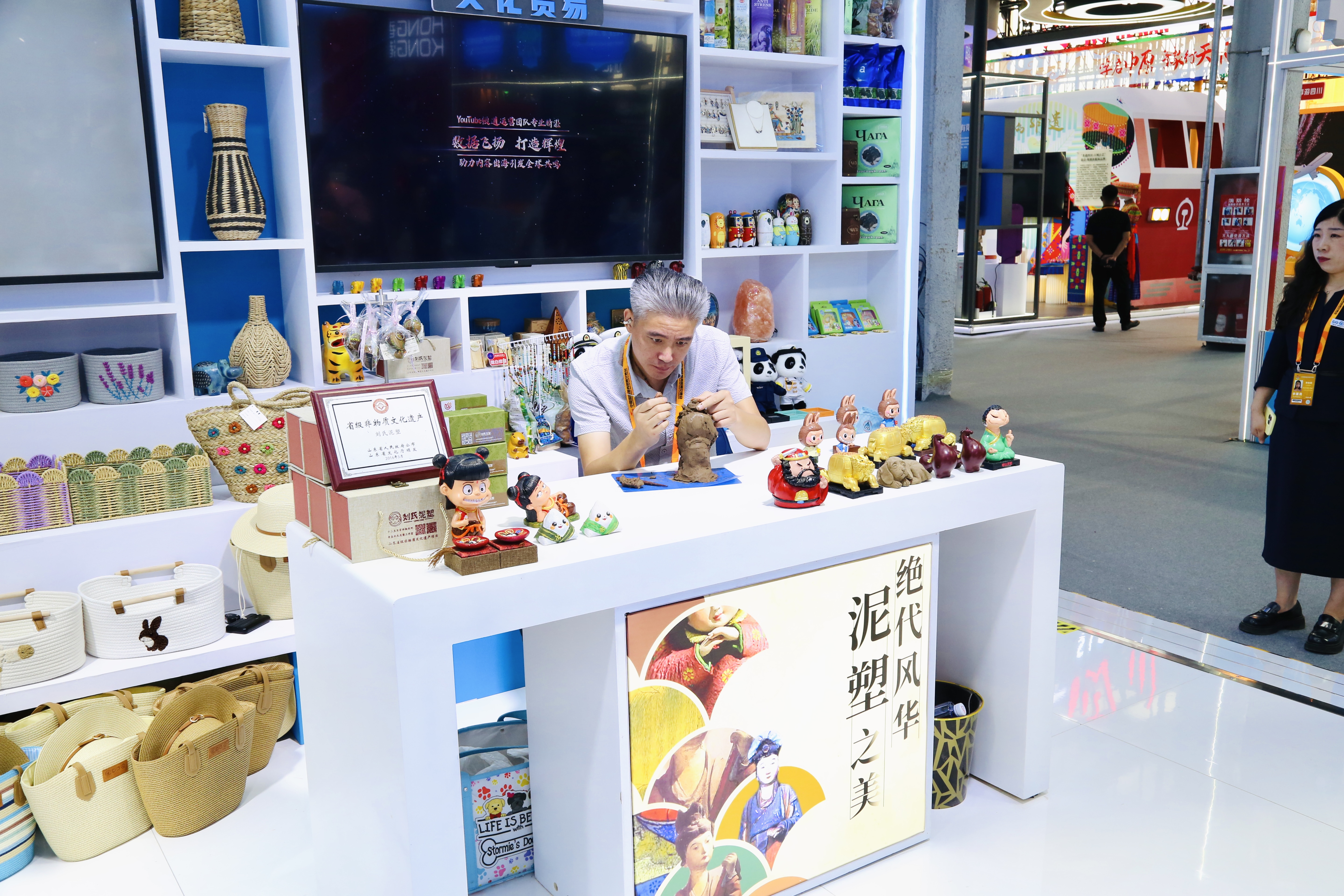 同时,在本次青岛展区中,“制作非遗漆扇互动区”与“非遗文化泥塑互动区”吸引众多观众驻足——青岛城阳区知临堂泥塑工作室的非遗传承人十指翻飞、技艺娴熟;荷田水铺则邀请观众现场体验漆扇制作、品尝特色人参水,还有平度工艺品厂的天然植物纤维草编产品......将青岛文化特色与贸易需求精准结合,推动传统非遗在互动体验中实现“活态传承”,为青岛文化服务贸易开辟了独具特色的新路径。