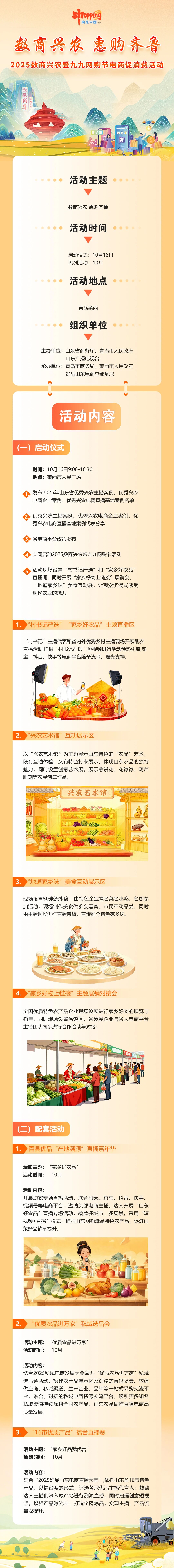 活动以“数商兴农 惠购齐鲁”为主题,围绕数字赋能农业、电商促进消费,举办系列形式多样、内容丰富的线上线下环节。活动现场将发布2025年山东省优秀兴农主播案例、优秀兴农电商企业案例、优秀兴农电商直播基地案例名单并邀请典型代表分享经验。同时,多家电商平台将集中发布助力政策,进一步激发消费潜力。