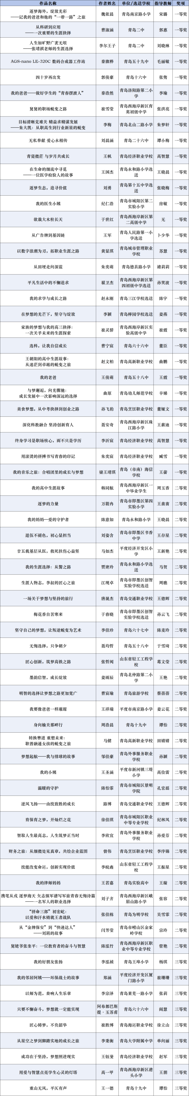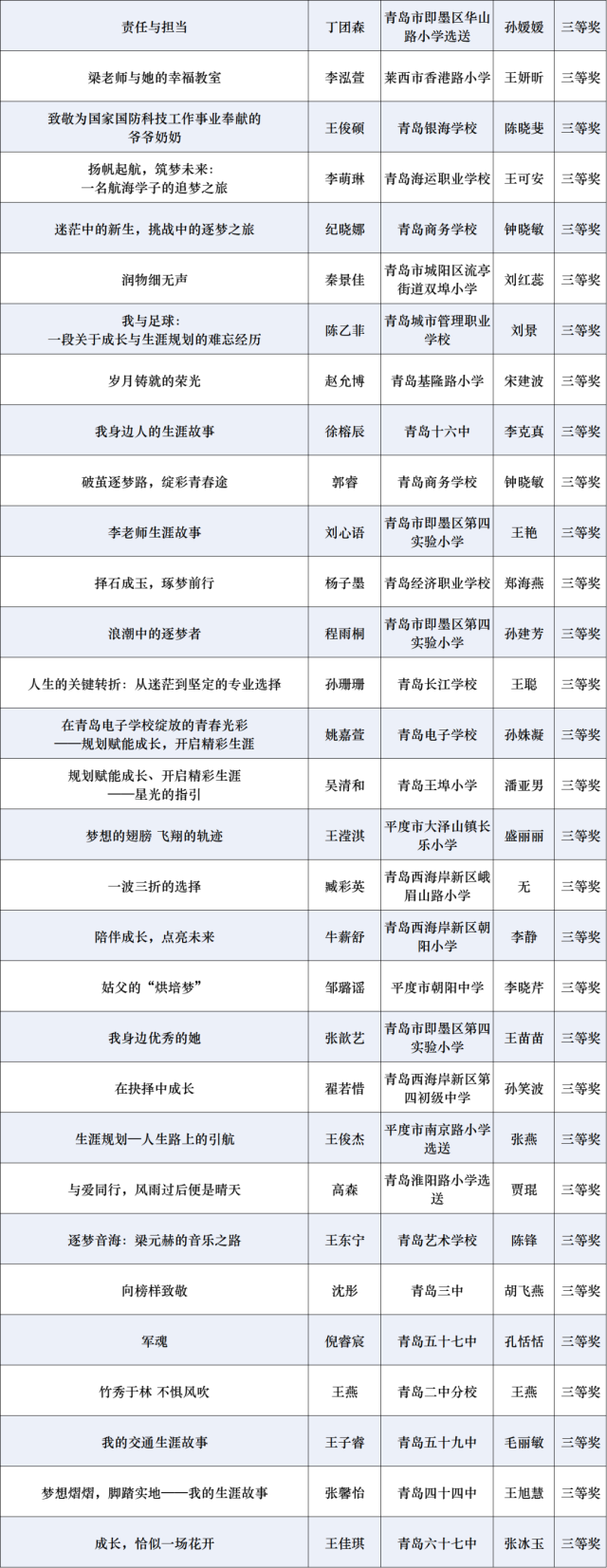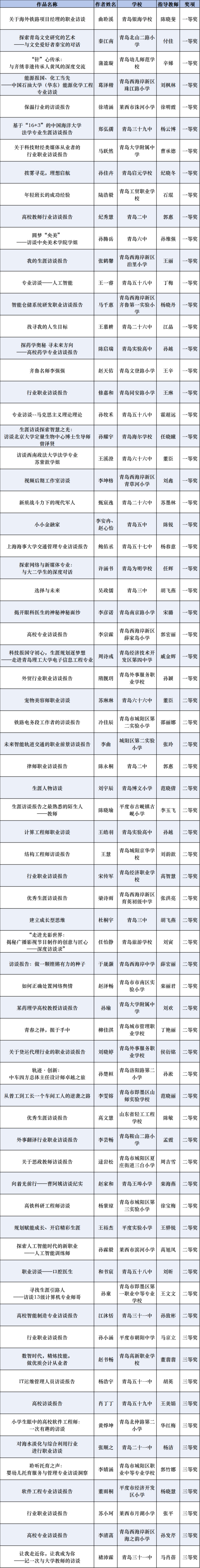 近日,青岛市教育局组织开展2024年青岛市中小学“优秀生涯案例、优秀生涯访谈报告、优秀生涯故事”征集评选活动,经过个人申报、学校(区市)推荐、专家评审等程序,最终评选优秀生涯案例、优秀生涯访谈报告、优秀生涯故事各100篇。