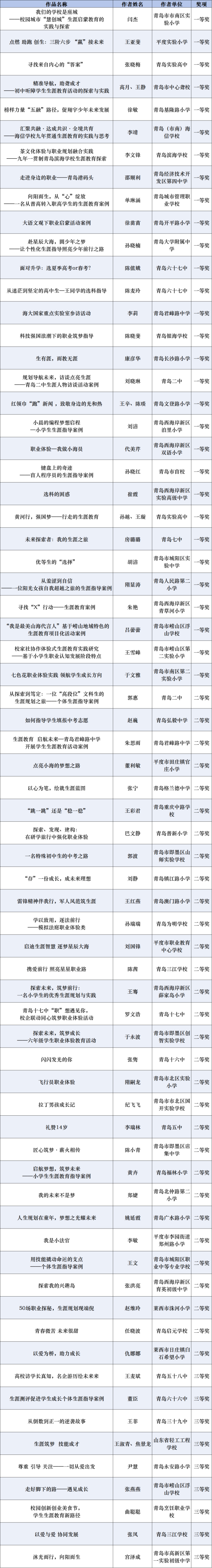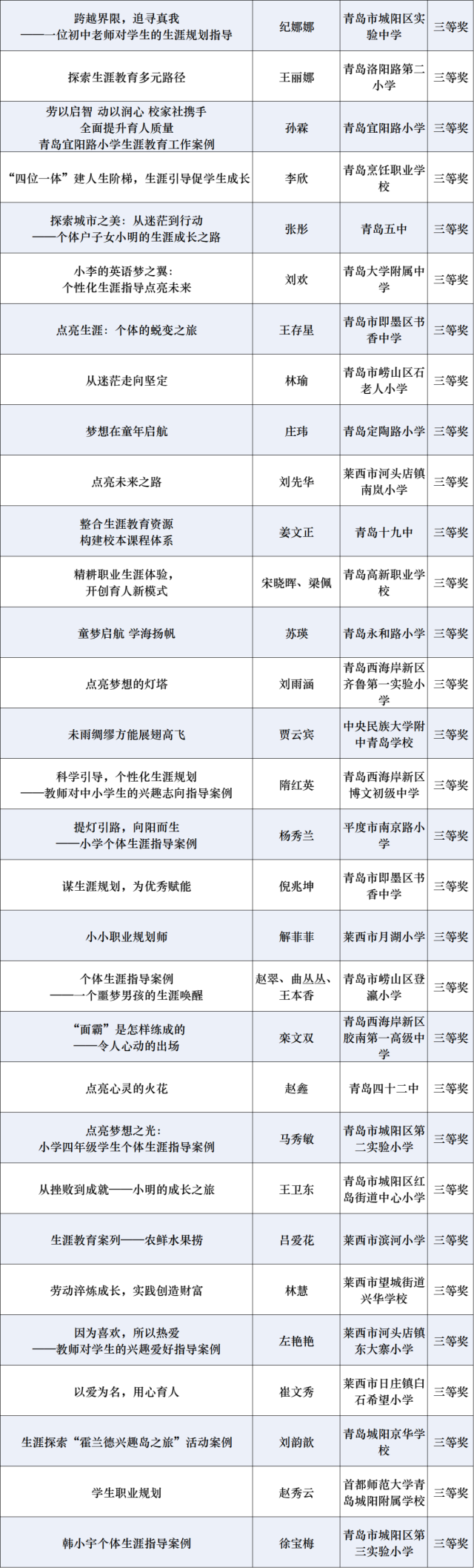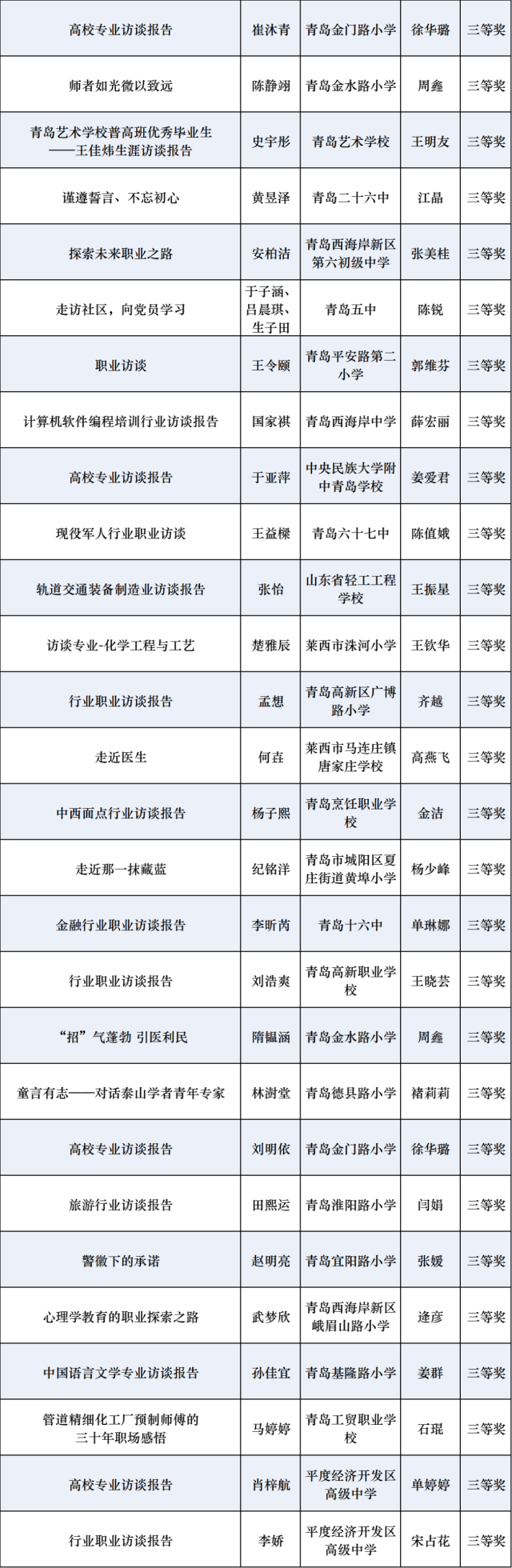 近日,青岛市教育局组织开展2024年青岛市中小学“优秀生涯案例、优秀生涯访谈报告、优秀生涯故事”征集评选活动,经过个人申报、学校(区市)推荐、专家评审等程序,最终评选优秀生涯案例、优秀生涯访谈报告、优秀生涯故事各100篇。