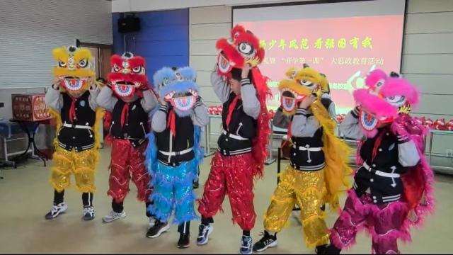 活动伊始,满载着新年的喜悦和祝福舞龙舞狮表演让大家眼前一亮,金鳞闪闪的龙狮队伍扭着身子迈着舞步,用欢腾的锣鼓敲响新学期的钟声,也将传统文化种进队员们的心田。