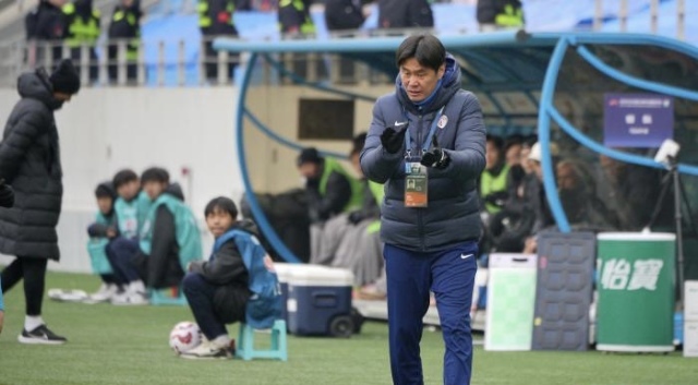 (2月23日,青岛海牛队主教练李霄鹏在比赛中临场指挥。毛道光 摄)