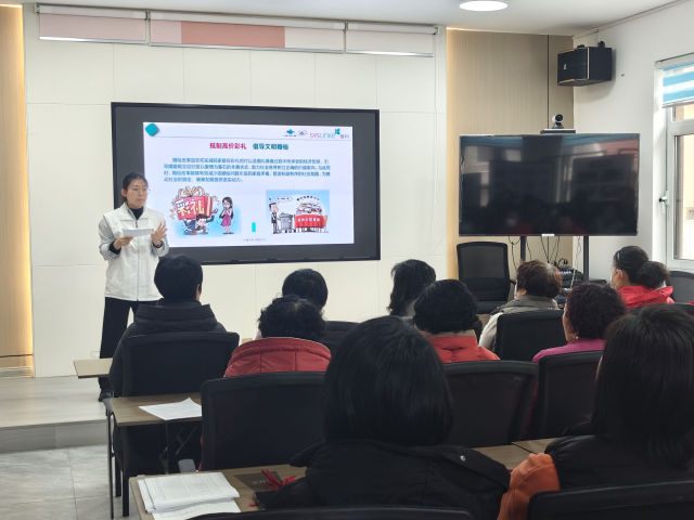 工作人员为在场的社区居民详细讲述传统婚俗中的陋习,如高价彩礼、繁琐婚礼流程等,这些陋习不仅给家庭带来沉重的经济负担,也影响社会的和谐稳定。紧接着,工作人员又介绍当前倡导的新婚俗新风尚,如拒绝高价彩礼、简化婚礼流程等,鼓励居民们树立文明、节俭、健康的婚姻观念。在居民们对传统婚俗陋习与新风尚有初步认知后,带领社区居民制作玫瑰。