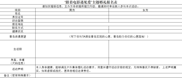 2024年1月1日之后登记结婚新人均可报名参加(含海外)。报名男女双方应提供准确、合法的信息资料及近照,报名方应按照活动主办方安排准时参加活动。