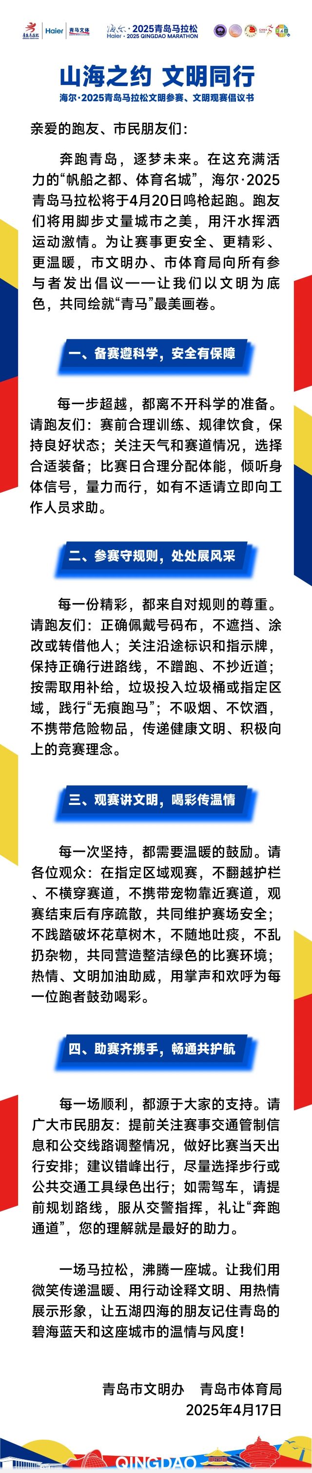 山海之约 文明同行 | 海尔·2025青岛马拉松文明参赛、文明观赛倡议书