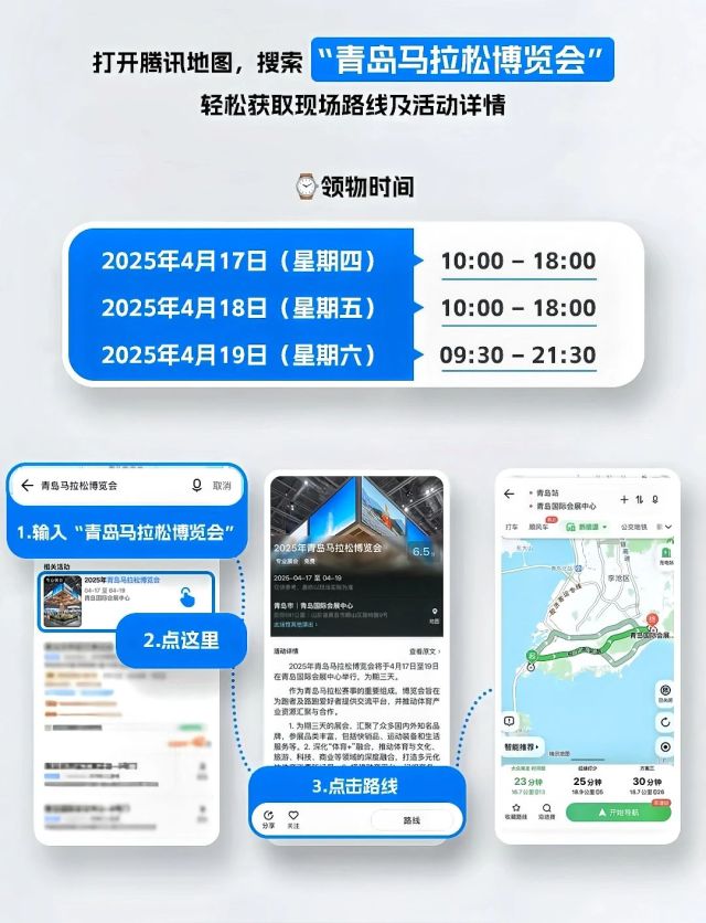 腾讯地图携手青马重磅推出△赛事专属导航打开腾讯地图,输入青马博览会目的地无论自驾、乘坐公共交通,还是选择绿色出行腾讯地图会为您规划最优路线避开拥堵,节省时间有了赛事专属导航去青马博览会的路不再迷茫轻松直达,畅享赛事盛宴!