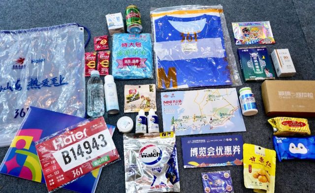 本届赛事参赛包内除参赛服、号码布、参赛指南、盐丸等常规物品外增加许多具有青马特色的物资海尔冰箱贴、号码布扣、青岛啤酒、新希望牛奶缔乐甘栗仁、青食钙奶饼干、爱回收毛巾等等。