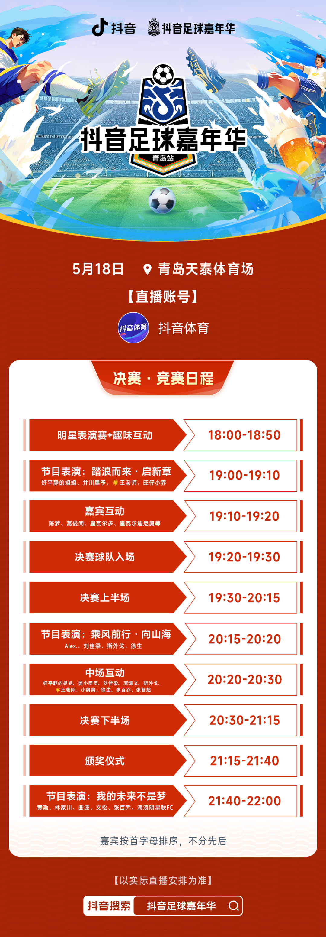 在5月18日青岛站决赛当晚,更有多领域嘉宾、抖音创作者到来,他们将带着各自领域的独特魅力,为这场足球盛会再添惊喜。