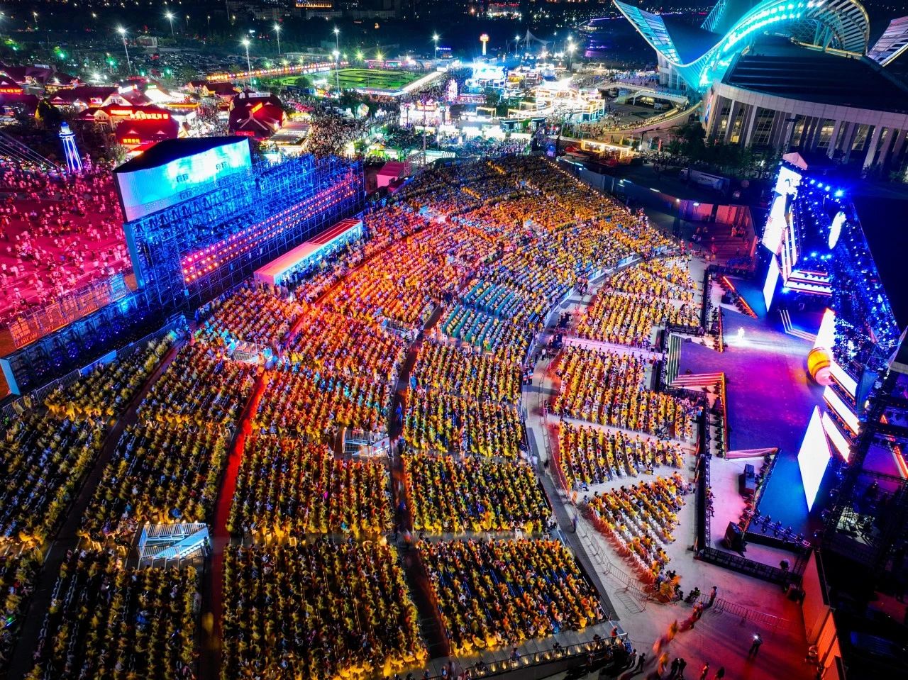 此次开幕式舞台采用国内顶尖声光设备呈现恢宏场景,集成全息投影、激光、焰火等技术,多维度视觉特效与空间叙事结合,构建虚实交织的沉浸式艺术场景。