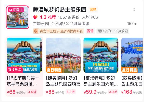 直播间精选城内、城外优质文旅产品,无论是中心舞台精彩主题演出、梦幻岛主题乐园缤纷游乐狂欢,还是“天空之境”高空水滑梯、“海上有青岛”全景秀,都尽在其中……纵览精彩之余,您更可品鉴品牌啤酒佳酿与地道特色美食,开启舌尖上的美味之旅!