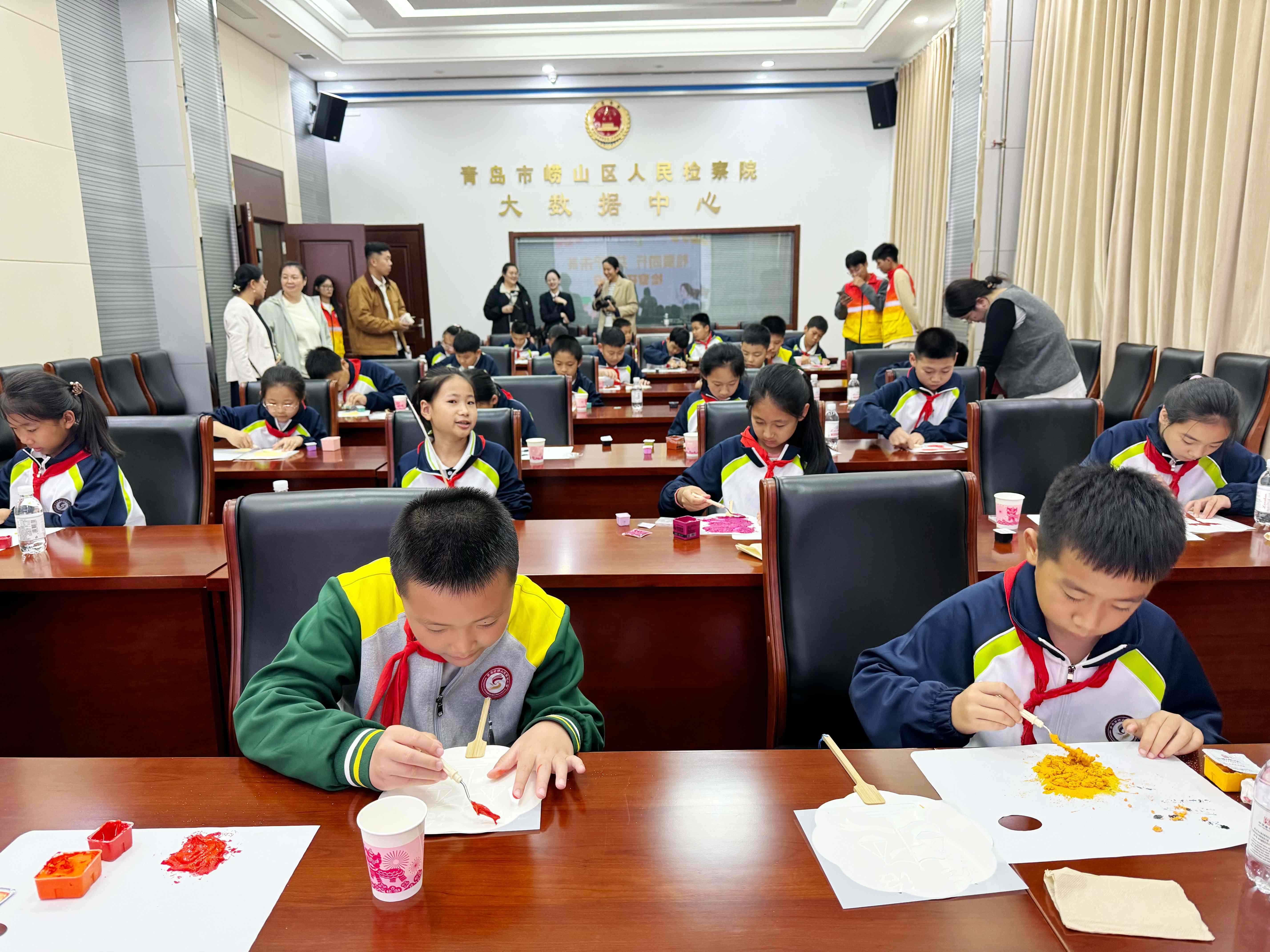 学生们在崂山区检察院制作法治主题肌理画团扇。