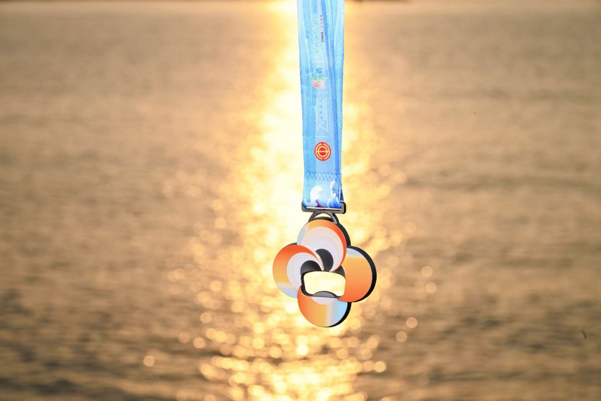 本届青岛男子海岸跑围绕“赛事进景区”的核心概念,旨在打造一场沉浸于山海风光中的活力盛宴。赛事现场整体以充满活力的橙黄色系为主导,既是秋季海滩的色调写照,也象征着市南城区的蓬勃朝气与男子跑者蕴含的运动力量。完赛奖牌以城市秋季植被——桂花形态为原型进行艺术变形,中心嵌入了“酒起子”功能,这一巧思让奖牌不再是橱柜中的摆设,而是可以融入生活的实用物件,打造“赛事+文创”的独特赛事亮点。