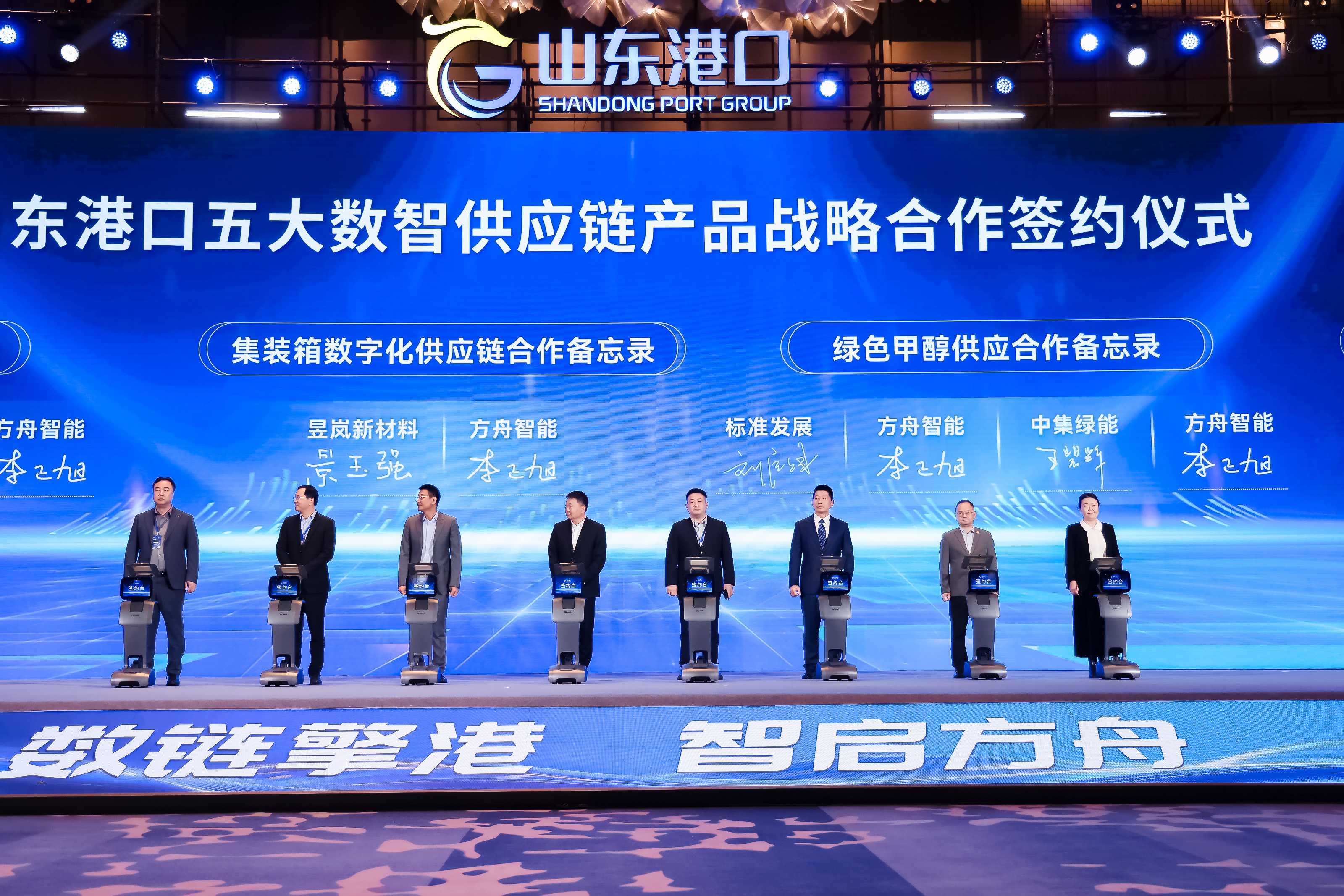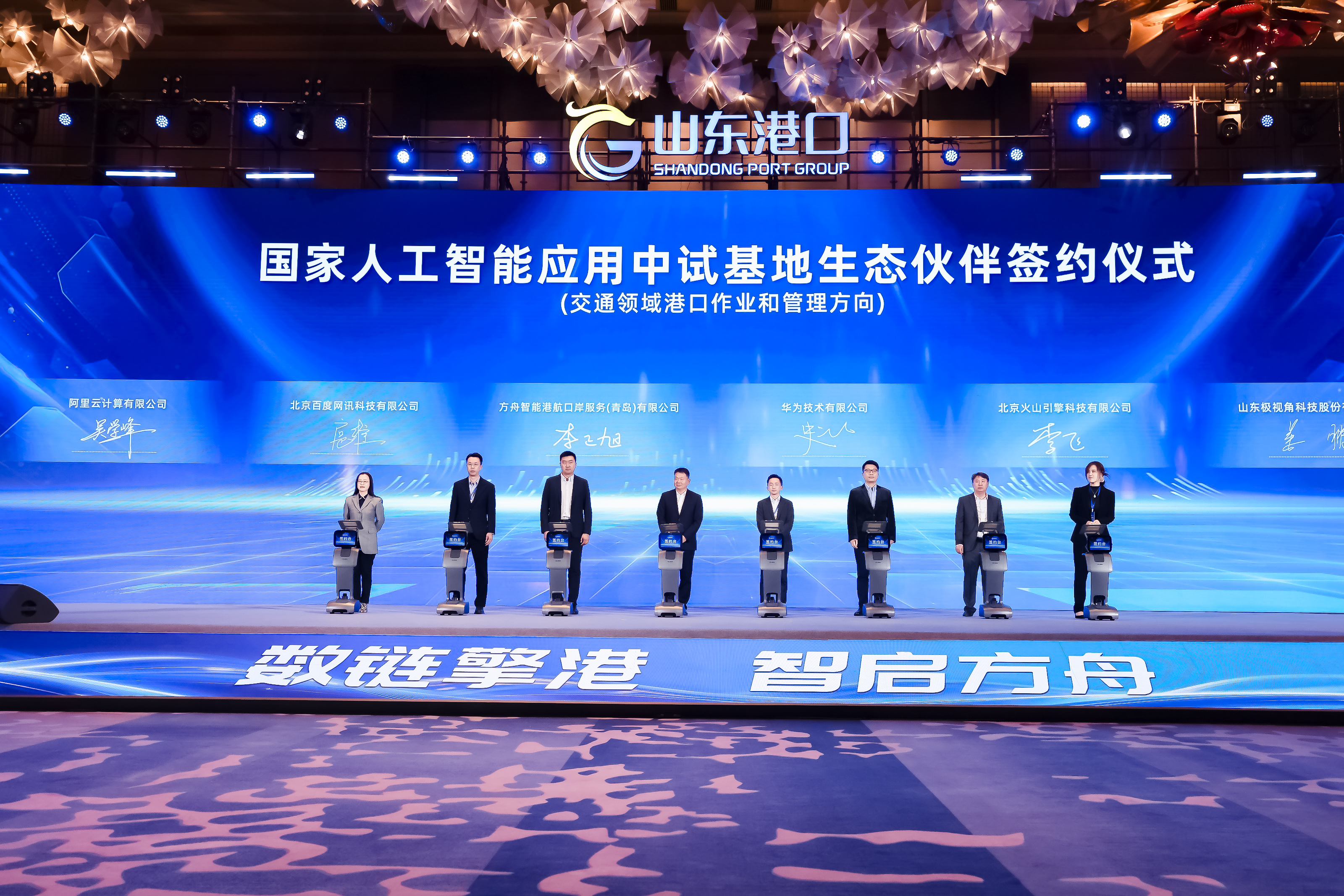 在签约环节,举行山东港口五大数智供应链产品战略合作签约仪式,签署干散货数字化供应链合作备忘录、集装箱数字化供应链合作备忘录、绿色甲醇供应合作备忘录及口岸金融服务合作协议;举行国家人工智能应用中试基地生态伙伴签约仪式,与阿里云计算有限公司等7家企业围绕交通领域港口作业和管理方向签约。