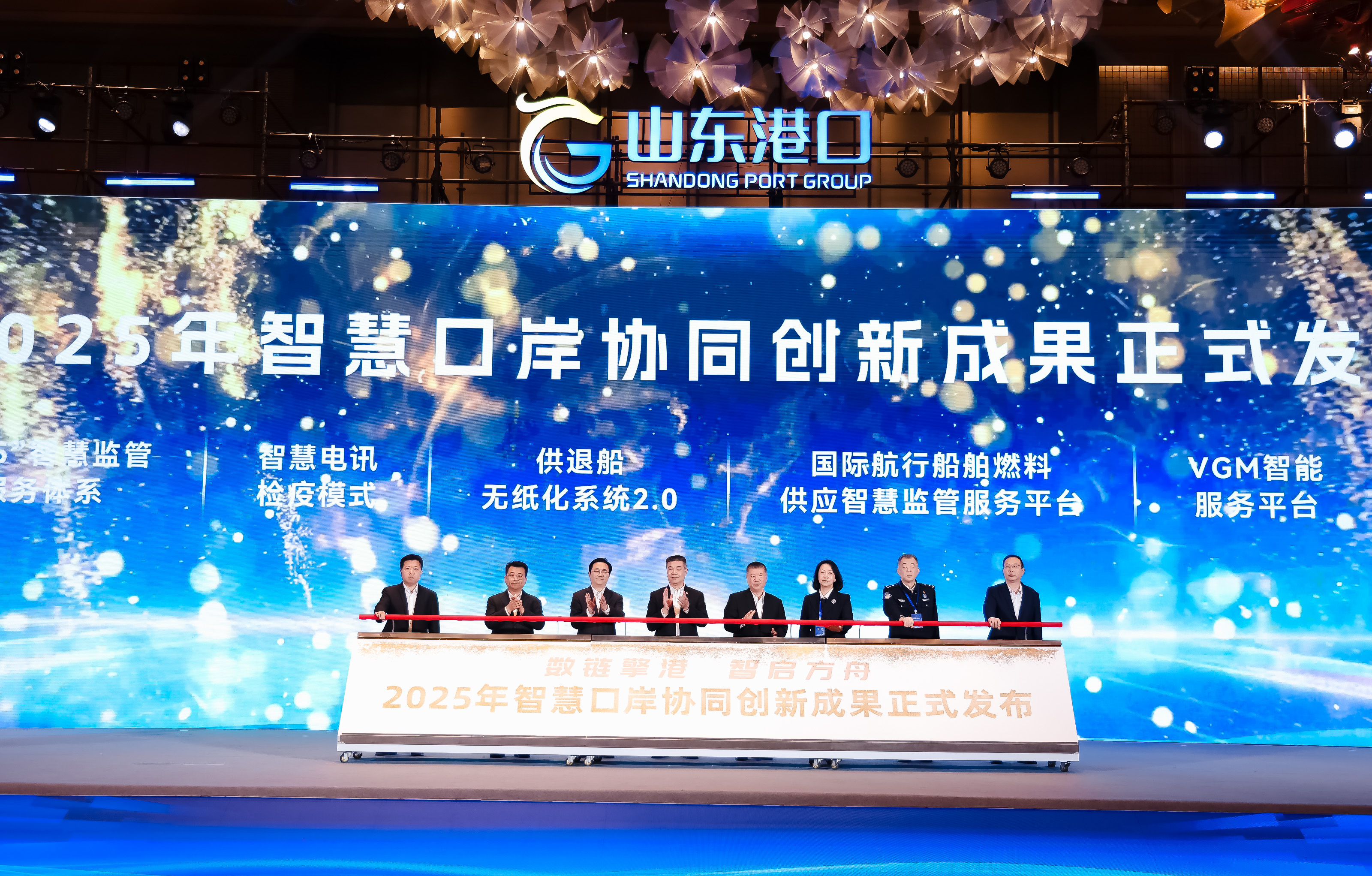 发布2025年智慧口岸协同创新成果,包含“山港通”智能转运、“1+5”智慧监管服务体系、智慧电讯检疫模式、供退船无纸化系统2.0、国际航行船舶燃料供应智慧监管服务平台、VGM智能服务平台及危险货物装卸作业一体化系统。