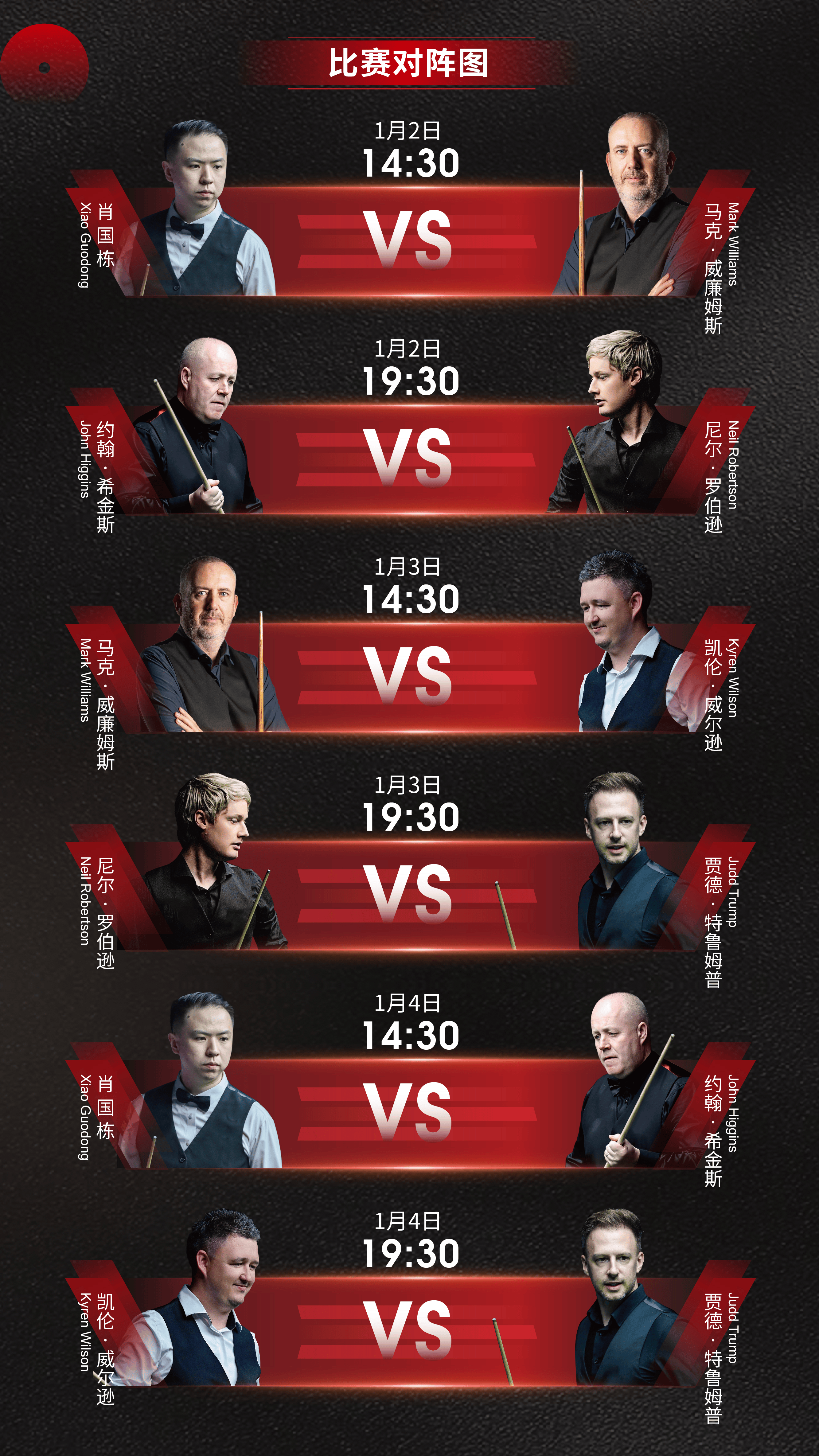 巨星云集,阵容豪华!2026年1月2日至4日,贾德·特鲁姆普将展现其标志性的闪电杆法,“金左手”马克·威廉姆斯将施展行云流水般的精准绝技,“巫师”约翰·希金斯将以大师级的战术智慧编织战局。此外,尼尔·罗伯逊的精准长台、凯伦·威尔逊的犀利攻势同样令人瞩目,中国名将肖国栋更将在家乡赛场全力以赴,展现风采。