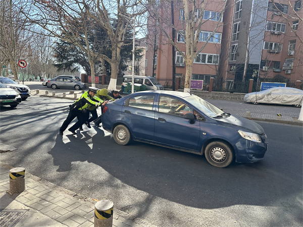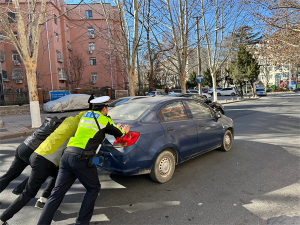 经了解,车主在驾驶过程中车辆突发故障无法启动,一时间手足无措,焦急的在原地等待救援。考虑到车辆停在路中间,会造成交通堵塞且极易引发交通事故,执勤警员二话不说化身“大力士”,一边徒手推车,一边帮助慌了神的驾驶员控制好方向盘,警民齐心合力将抛锚车辆推至安全路段,保障了道路的通畅,为驾驶员化解了困境。