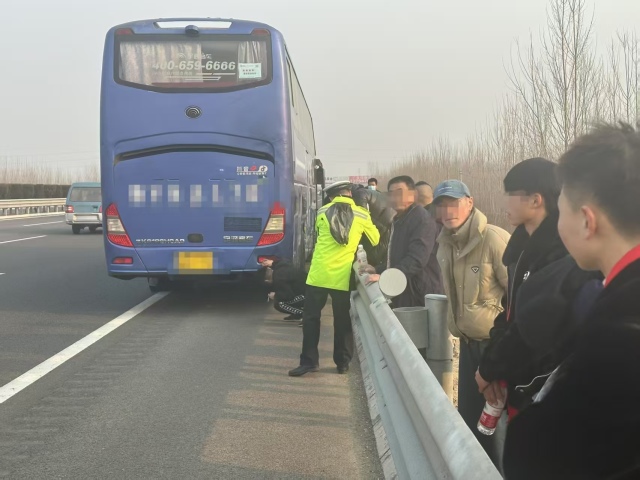 民警立即在客车后方停靠,摆放警示锥桶,转移车内乘客至护栏外侧,并联系路政部门来现场做安全防护。随后,民警对驾驶员车辆故障后未按规定设置警示标志,以及未及时转移车内人员的行为进行了批评教育。驾驶员称,车内40多名乘客来自潍坊某公司,包车去青岛参加当晚的年会,现公司负责人正联系其他客车前来转运。