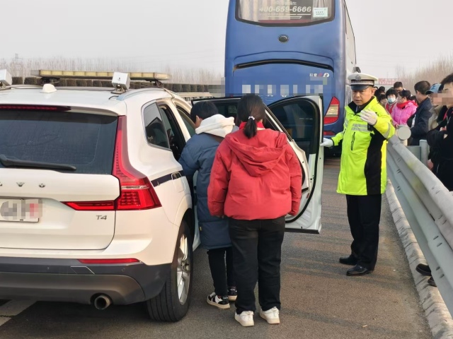 天色渐晚,气温较低,在了解到重新派车转接乘客需要等待约一小时的情况后,为消除安全隐患,保证人员安全,民警立即请示大队带班领导,而后大队派出5辆警车转运乘客至服务区内等候客车。
