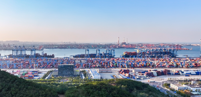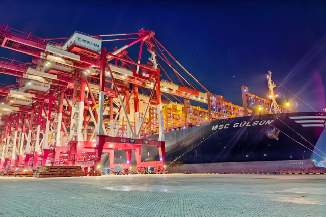 山东港口青岛港集装箱码头船舶饱满,作业效率频创新高。
