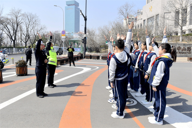 接着,交警向学生们讲解交通指挥手势的动作及含义,学生们目不转睛地观察交警的每一个动作,认真模仿,从简单的停止手势到复杂的直行手势,大家反复练习,逐渐掌握了基本要领。为了让同学们更深入了解交警的工作,交警还带领学生们来到路口,对来往车辆进行模拟指挥。在交警的指导下,学生们观察交通信号灯的变化,感受交通指挥手势在交通管理中的重要作用,同时也体会到了交警日常工作的辛苦与责任。