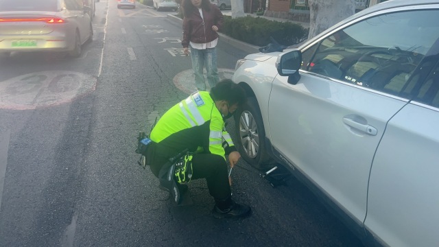 据了解,事情发生在前一天的18时30分许,此时正值晚高峰时段,交警市南大队文登路中队巡逻警力在巡逻至延安一路文登路路口附近时,发现一辆白色越野车,打着双闪,停靠在路边,见此情形,巡逻警力立即上前询问情况。经了解,车主祝女士在驾驶过程中,被好心司机提醒,左前轮胎缺气严重,便将车停靠在此处,因没有换胎经验,且没有操作工具,只能原地等待救援。为避免引发车辆拥堵和安全隐患,巡逻警力迅速在车辆后方设置警示标志,以防发生二次事故。紧接着,从车后备箱中取出千斤顶、扳手等工具,开始有条不紊地更换轮胎。在更换轮胎的过程中, 还不忘向祝女士普及一些车辆应急处理知识。经过一番操作,成功将备胎换到了故障车上。随后赶来的祝女士家人及其本人被交警的热心帮助深深的触动,这才出现了开始的一幕。