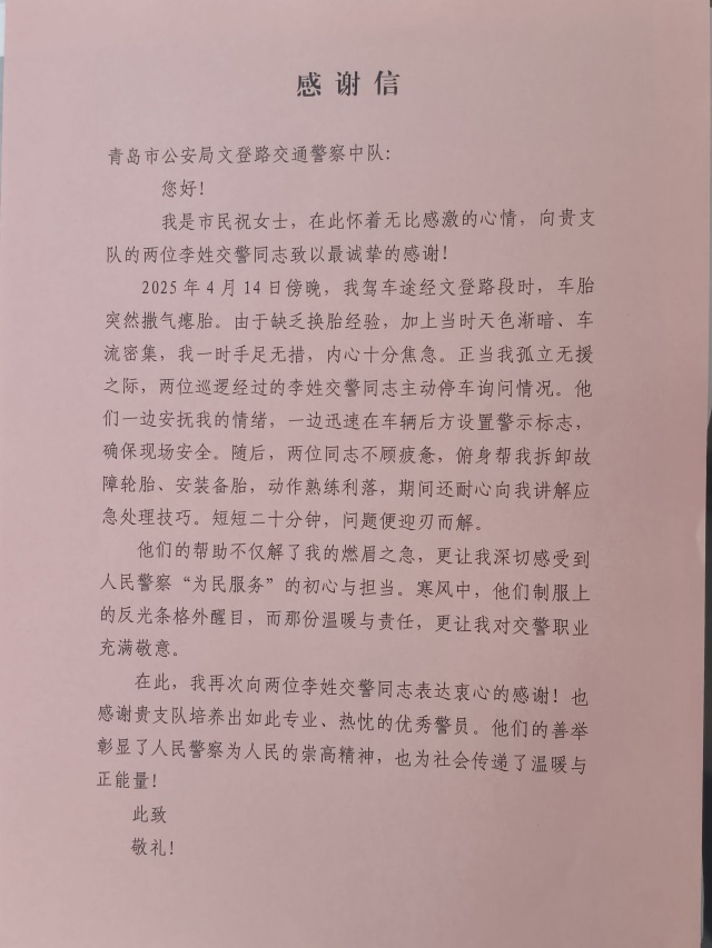 4月15日上午,青岛交警市南大队文登路中队收到一封感谢信,纸短情长,字里行间表达了对市南交警暖心之举的感激之情。