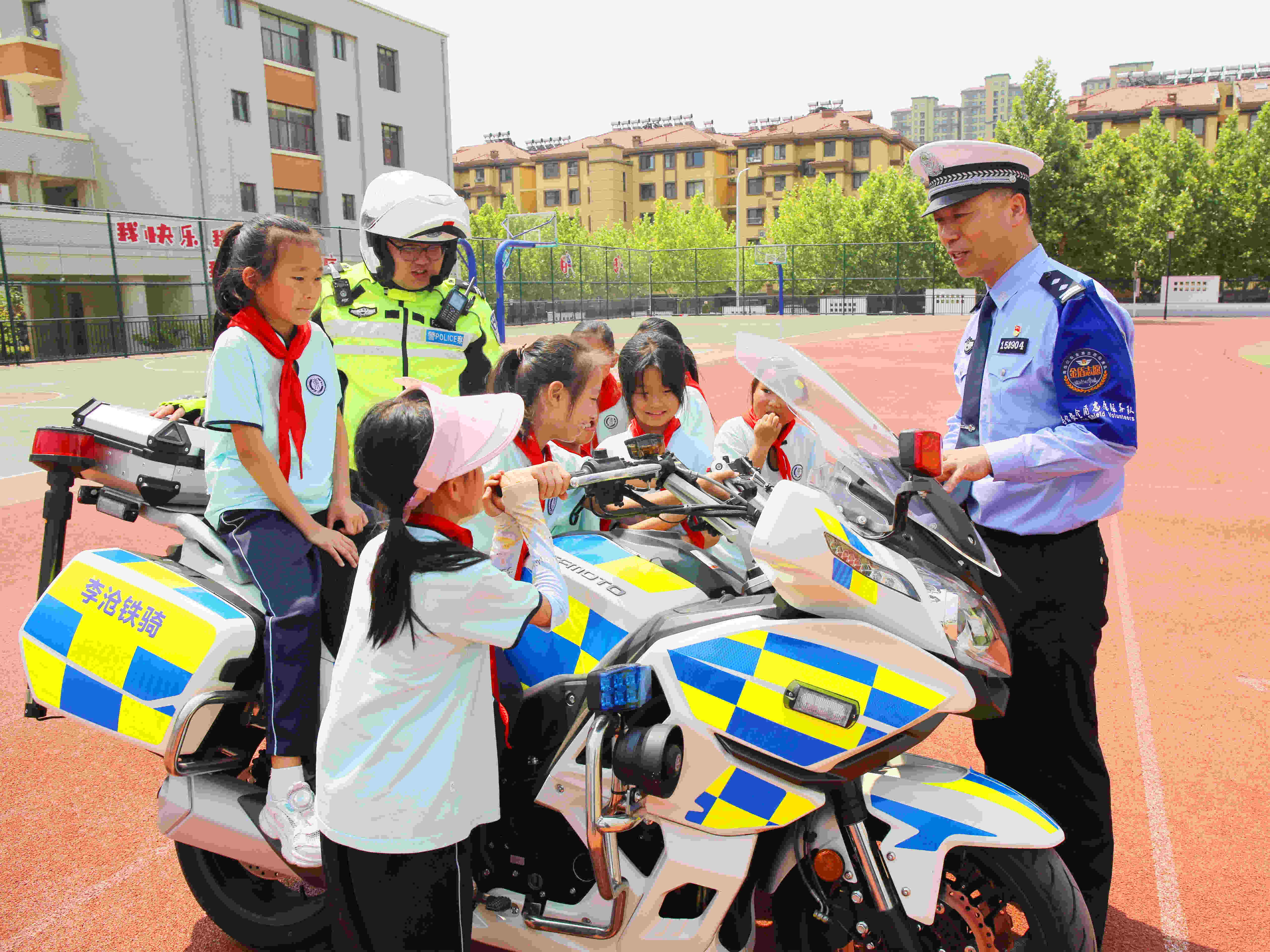 活动尾声,交警铁骑队员驾驶警用摩托车闪亮登场,孩子们垫脚张望、鼓掌欢呼。当交警邀请学生代表触摸警灯、体验坐骑时,操场瞬间沸腾。“铁骑好酷!我长大也要当交警!”孩子们依次被交警抱上摩托车后座,纷纷与摩托车合影留念,灿烂的笑容被镜头永久留存。活动中,交警还特别展示了交通安全志愿者旗帜,讲述金盾标志的含义及背后守护平安的使命,希望小朋友们也能成为安全宣传的小使者。孩子们纷纷表示,要把学到的安全知识带回家,让自己的家人一起来遵守。