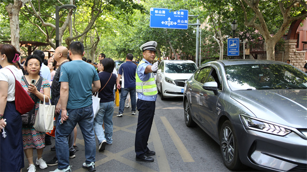 早上6点30分,执勤交警提前到岗到位,在考点周边路口、路段设置“机动车绕行”“禁止乱鸣笛”等交通标志和温馨提示牌,摆放反光锥桶,加强对过往车辆的疏导和管控,确保送考车辆优先通行。交警指挥中心加强对全市10个考区39个考点周边主要道路、城市高架路等路段视频巡检力度,全力做好考点周边交通管理的指挥调度,并通过道路诱导屏,分时段发布“考点周边 减速慢行 请勿鸣笛”等信息。交警部门还在每个考点周边设置服务点,配备警车、警用摩托车,随时为考生和家长提供便民服务。同时,安排铁骑队员在考点周边道路不间断巡逻,及时处置各类突发情况,确保考点周边道路安全畅通。