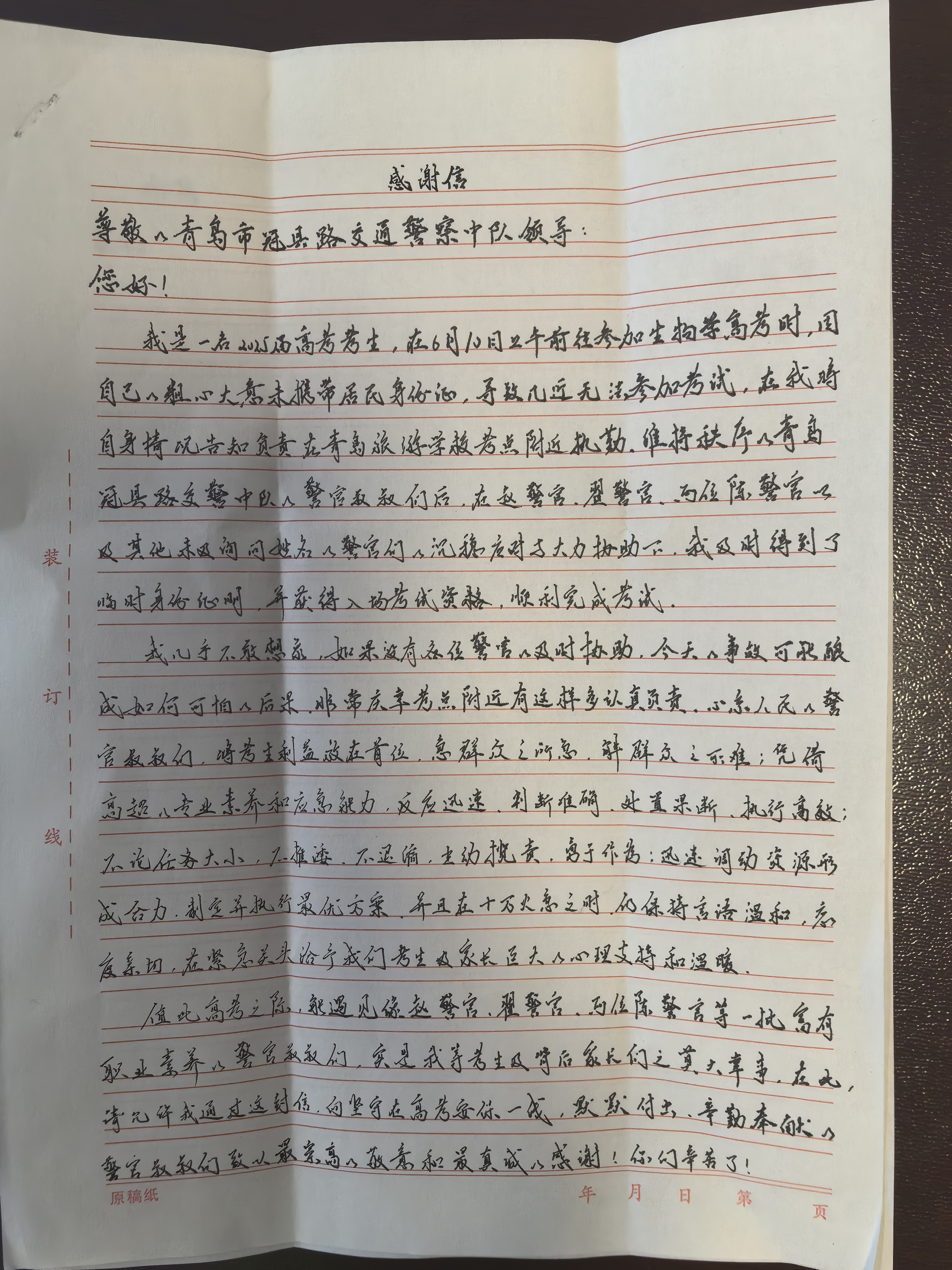 2025年7月2日上午,一位应届高考男生与其父亲专程来到青岛交管支队市北区大队冠县路中队,将一面印有“交警显神威 危急时刻伸援手”的锦旗送到执勤铁骑赵宝奇手中,感谢交警给予热心帮助,考生顺利参加考试,并取得理想成绩。