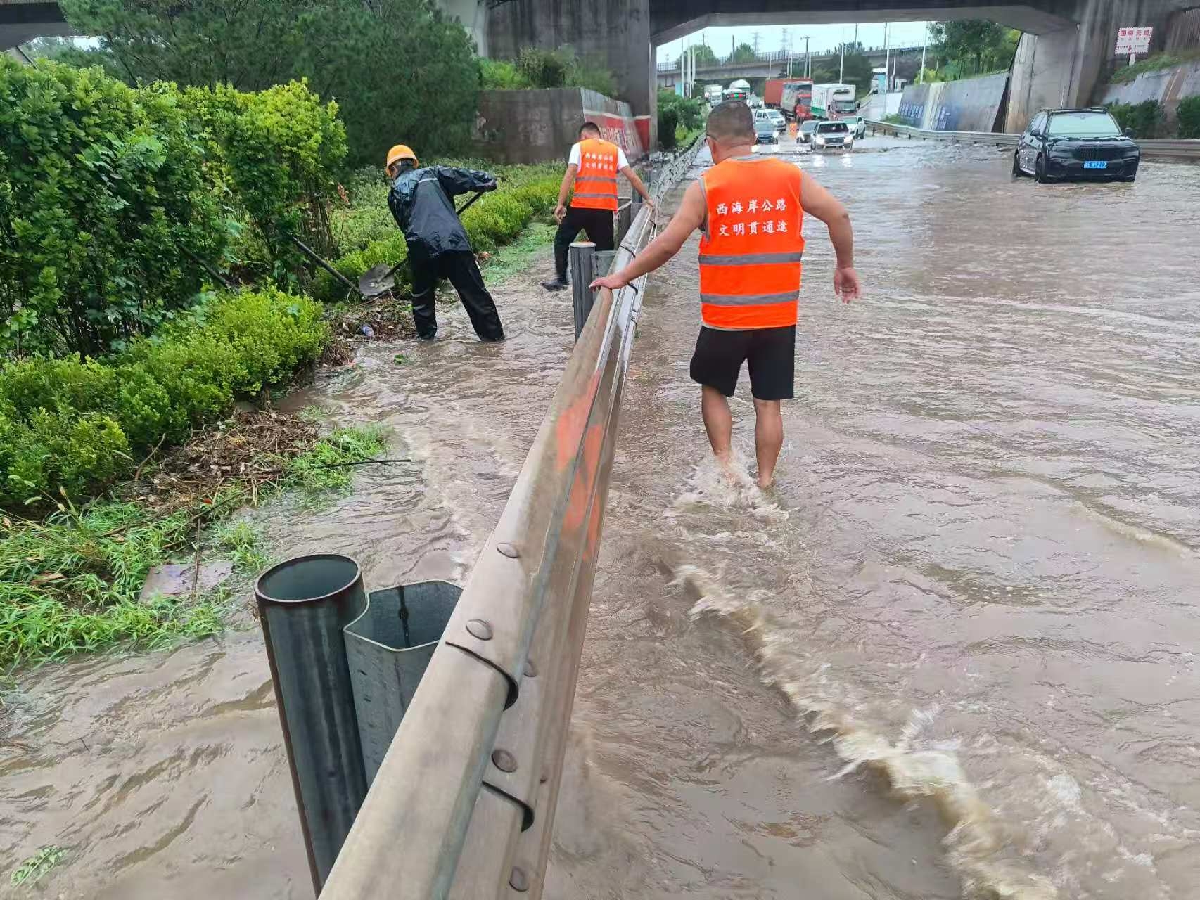 上午11点30分,泊里公路站巡查人员发现张海路K28+500疏港铁路桥下出现严重积水,一辆小汽车被困水中。巡查人员立即开展抢险作业,在积水区域周边设置防撞桶,阻止后续车辆继续进入险区,同时协助被困车辆脱困,疏通道路排水设施。经过1个小时奋战,路面积水逐渐消退,被困车辆安全驶离,道路恢复安全通行。