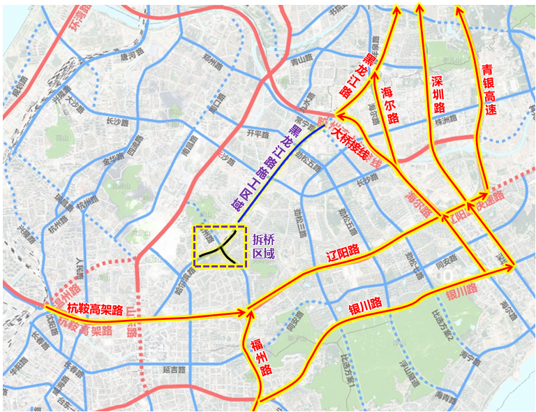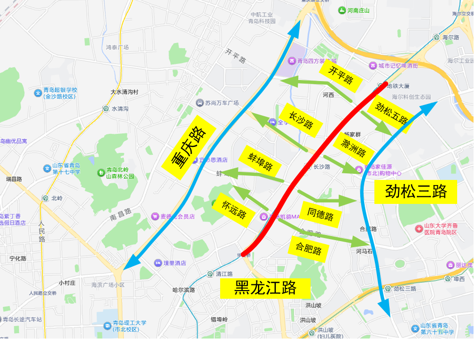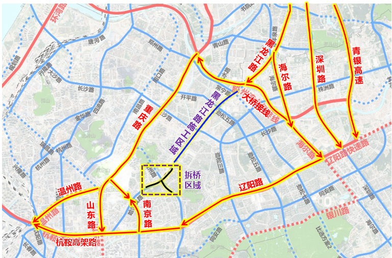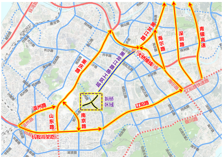 提前经杭鞍高架路-辽阳路、温州路-重庆路、山东路-重庆路绕行,至海尔路、深圳路、大桥接线转黑龙江路向北通行。