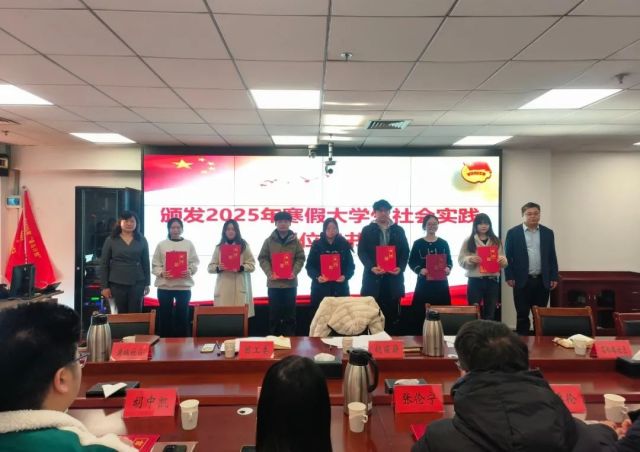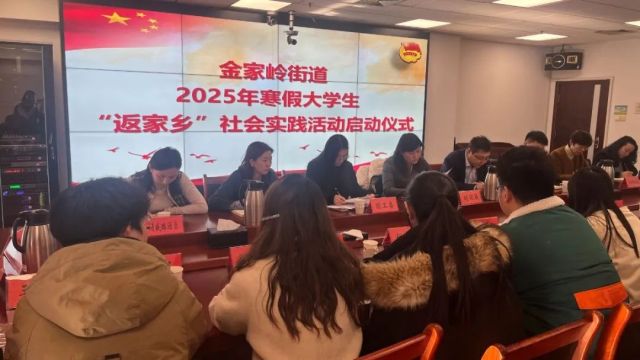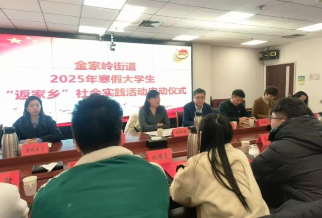 启动仪式上为金家岭街道2025年“青鸟计划”寒假大学生“返家乡”社会实践活动授出征旗,并为参加本次社会实践的学生发放了岗位聘书。