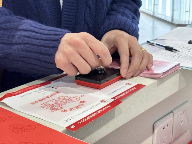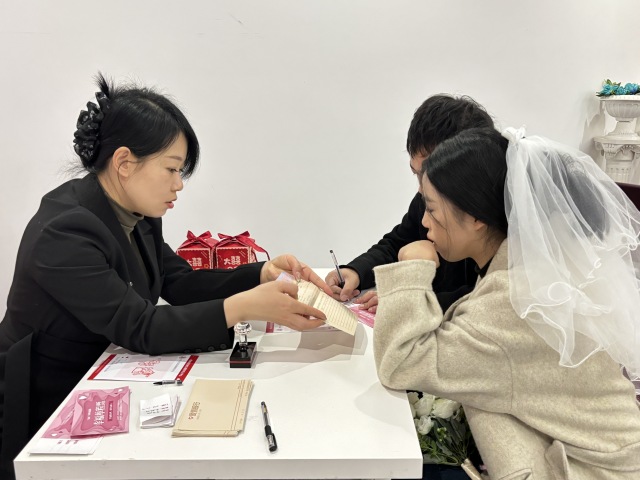 完成集章打卡的新人可以领取一本“爱情存折”,以后的每年周年纪念日可以凭借着存折回婚姻登记处领取新的存折,以此打卡纪念,作为新人爱情的见证。