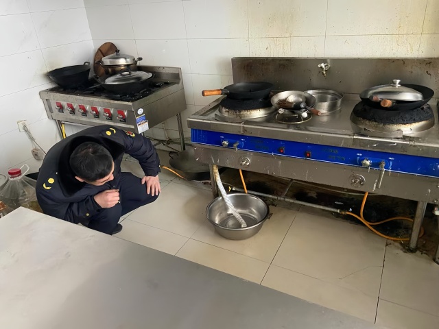 金家岭综合行政执法中队重点对香港东路、同安路、仙霞岭路以及午山一路沿线的商铺、社区助老食堂进行执法检查。执法人员对燃气管道、阀门、接口等关键部位进行查看,排查燃气设施是否存在燃气泄漏、管道老化及阀门松动等问题,核实燃气泄漏报警装置的安装与运行状况等。检查中发现2家餐饮单位燃气间堆放杂物,存在较大安全隐患,执法人员现场普及燃气安全使用常识、应急处置方法以及相关法律法规,要求店铺立即整改。