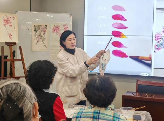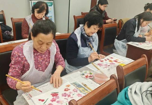 接着,专业老师详细介绍了雨水节气的特点以及桃花在传统文化中的象征意义,并从桃花的形态、色彩搭配、构图技巧等方面进行了详细讲解。在老师的现场示范下,居民们纷纷拿起画笔,蘸取水彩,开始描绘自己心中的“雨水桃花”。他们或低头专注描绘,或相互交流心得,现场气氛热烈而温馨。