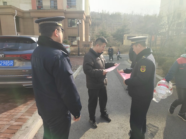 “您好,我们是崂山区综合执法工作人员,今天进社区开展普法宣传,这是涉及市容环境、圈占绿地、私搭乱建等综合执法工作的宣传资料,您可以了解一下。”在青岛市崂山区书香门第、金领世家等小区内,青岛市崂山区金家岭街道金家岭执法中队执法人员正在向路过的居民递上宣传册。