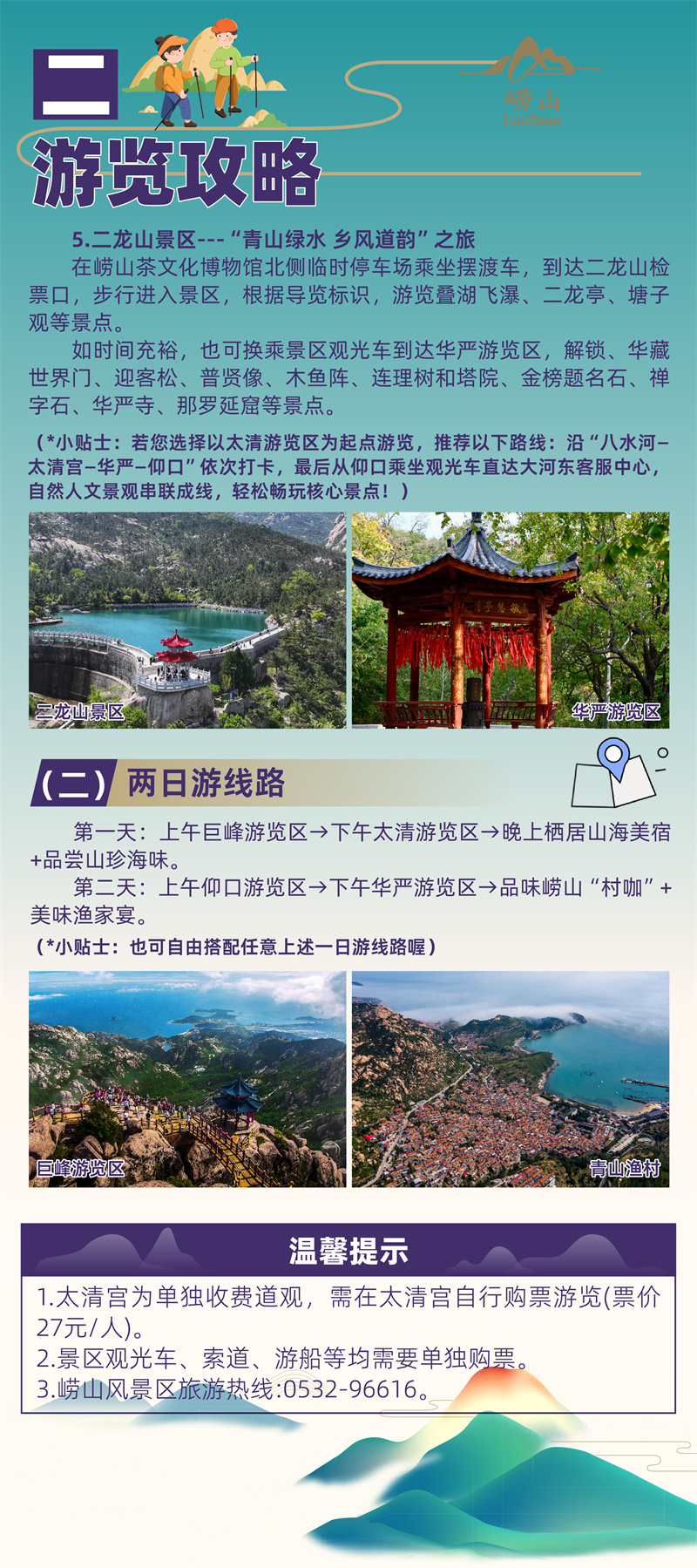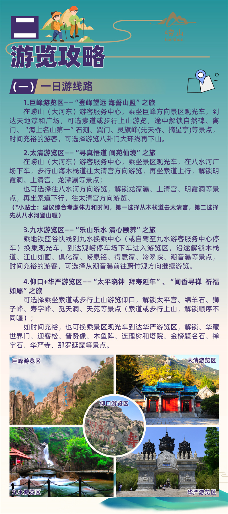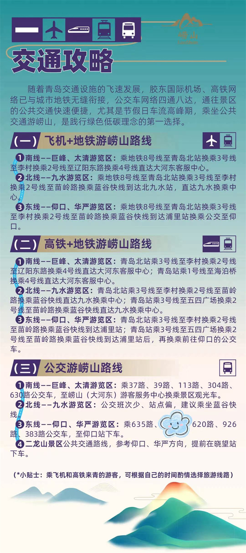 五一假期青岛崂山景区迎来客流高峰,仰口方向车多缓行。建议您优先公共交通,低碳出行方式。或者前往太清、巨峰、九水景区游玩。 乘地铁4号线在大河东站下车,可直达崂山(大河东)客服服务中心,选乘前往巨峰或太清游览区的观光车。 乘蓝谷快线在北九水站下车,可直达九水换乘中心,换乘观光车前往九水游览区。